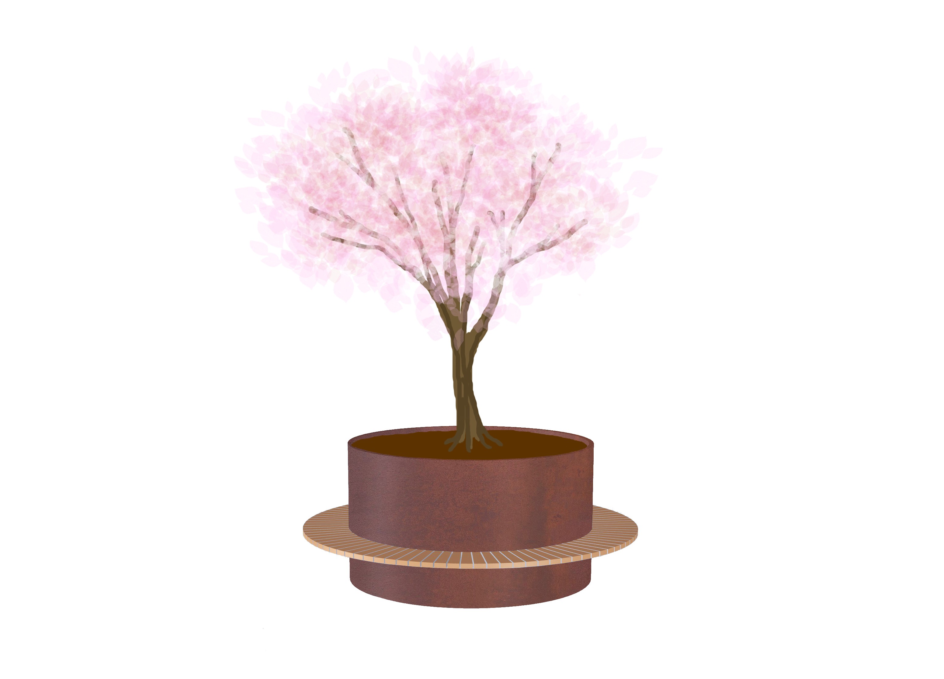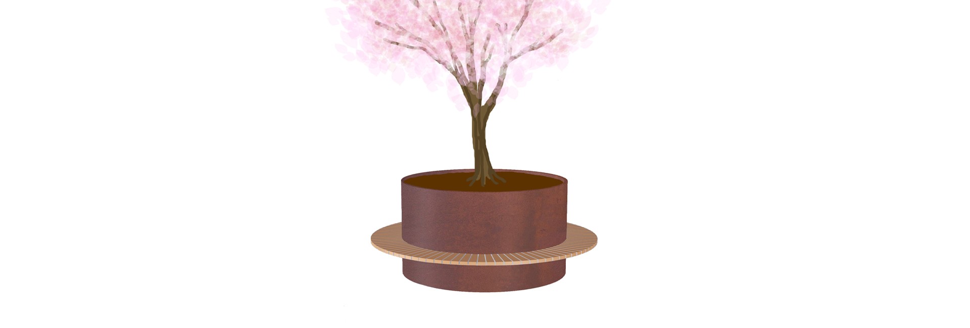 Jardinière en acier thermolaqué permettant la plantation d'un arbre, avec assise en bois lamellé.
