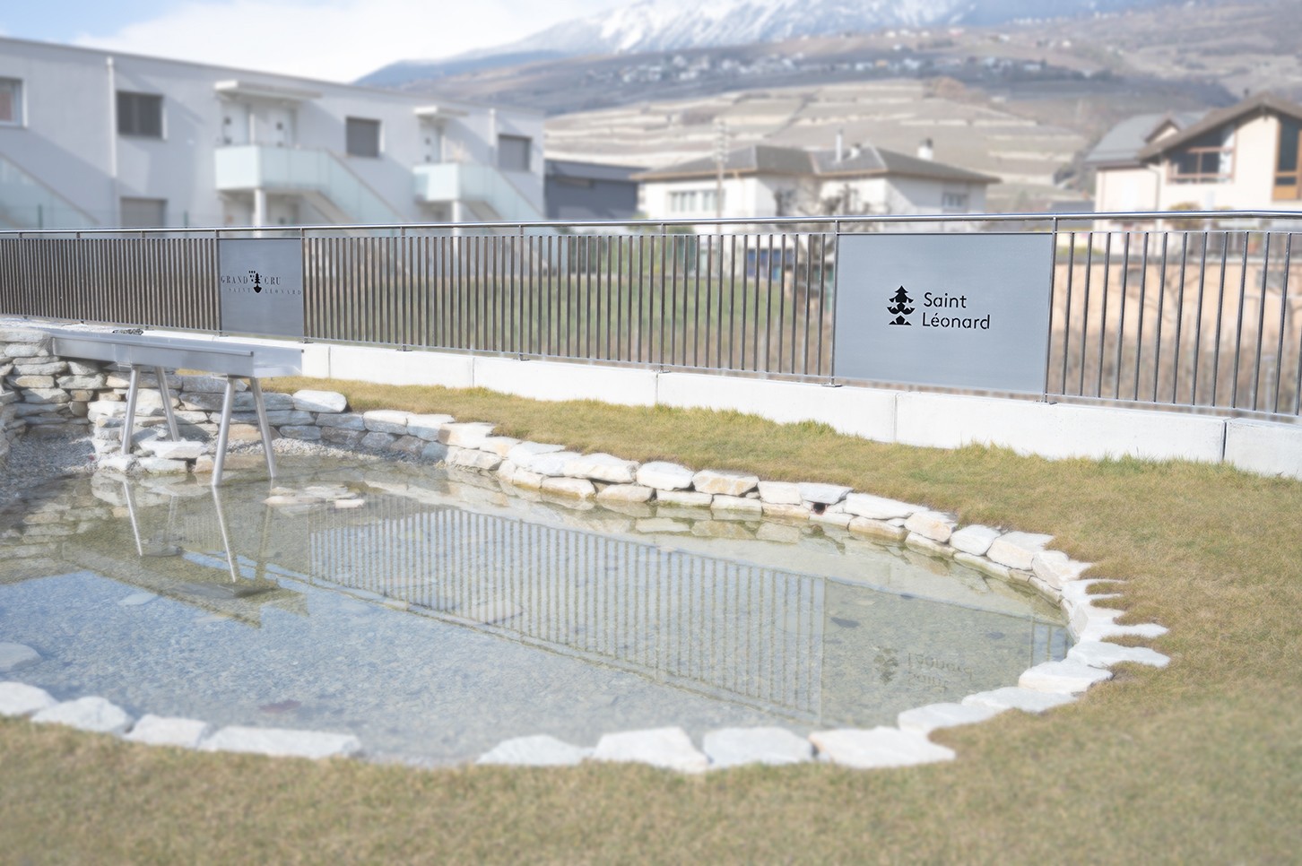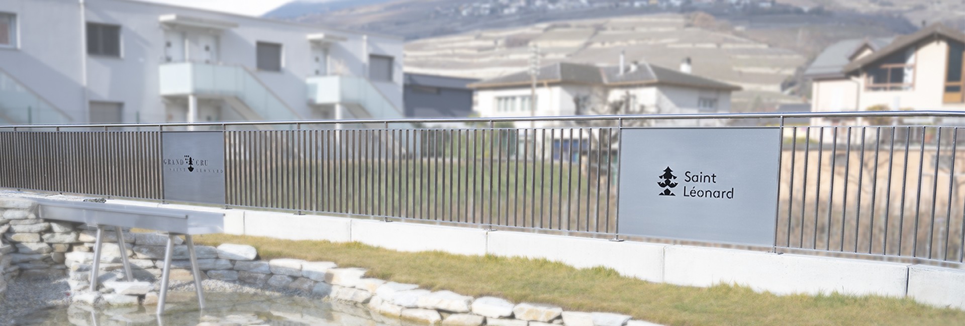 Barrière à bâtons inox et panneaux avec motifs personnalisés, thermolaquage RAL à choix ou brossé.