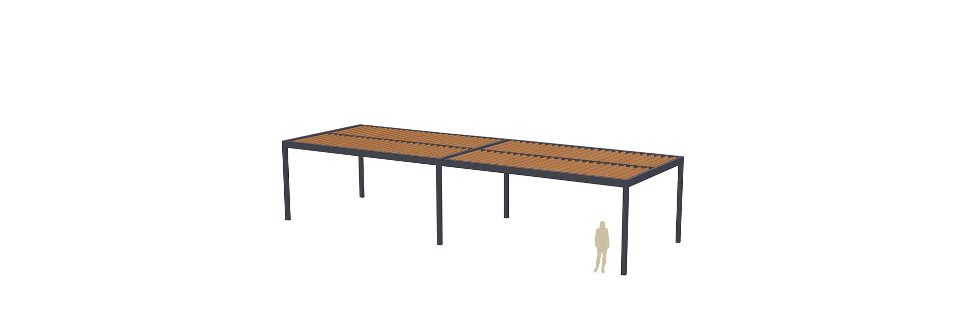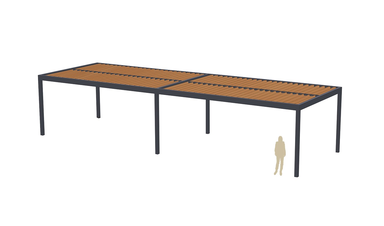 Pergola sur mesure en acier inox thermolaqué, avec lames en mélèze.