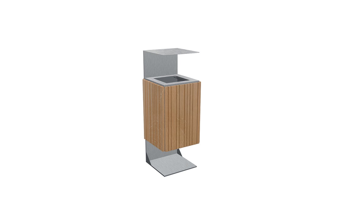 Poubelle en acier inox brossé/microbillé et placage en chêne, avec ouverture par basculement vers l’avant.